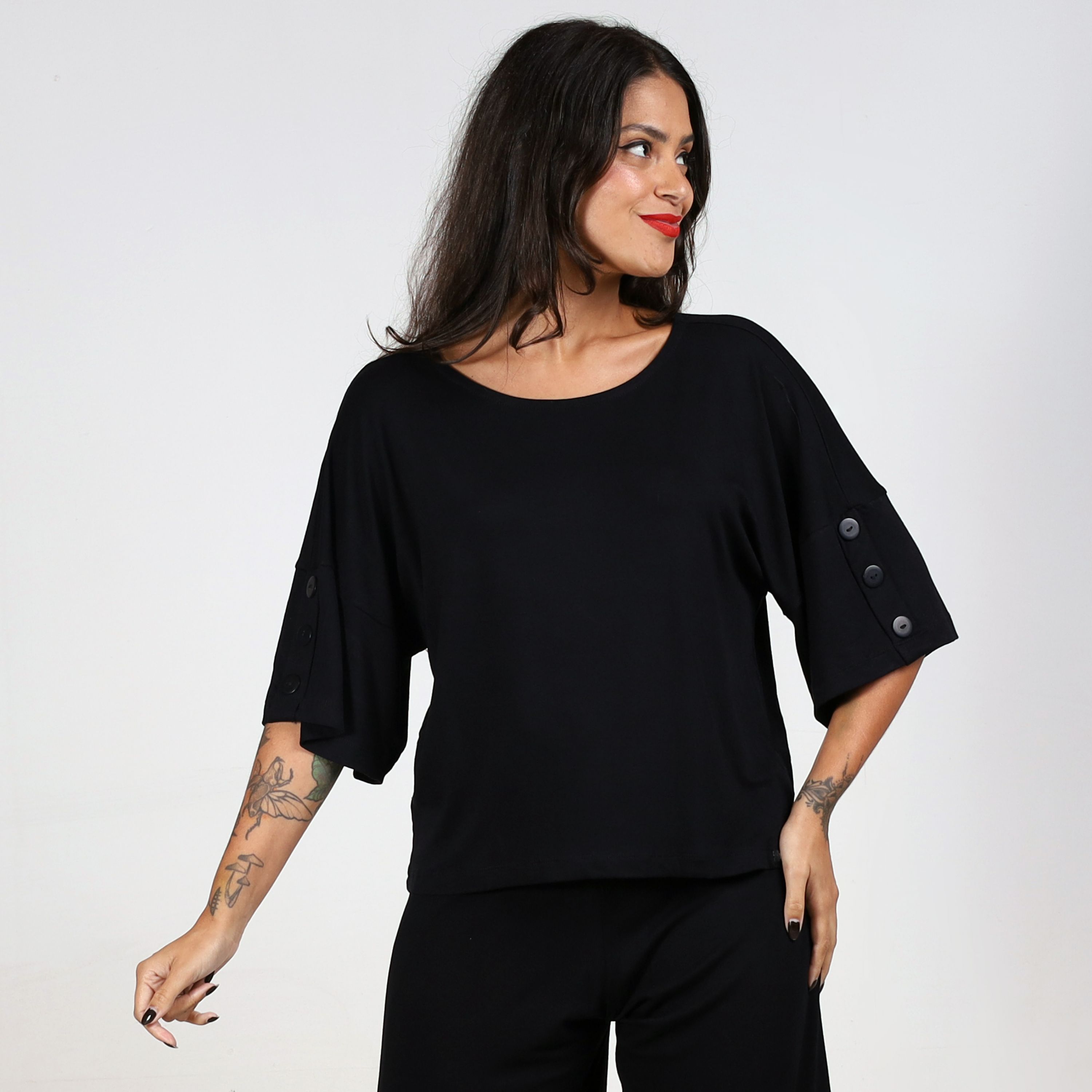 Nossas roupas são feitas com tecidos de alta qualidade, como viscolycra, viscose com elastano, poliéster, cirrê e suplex com poliamida, escolhidos para unir conforto, estilo e durabilidade.