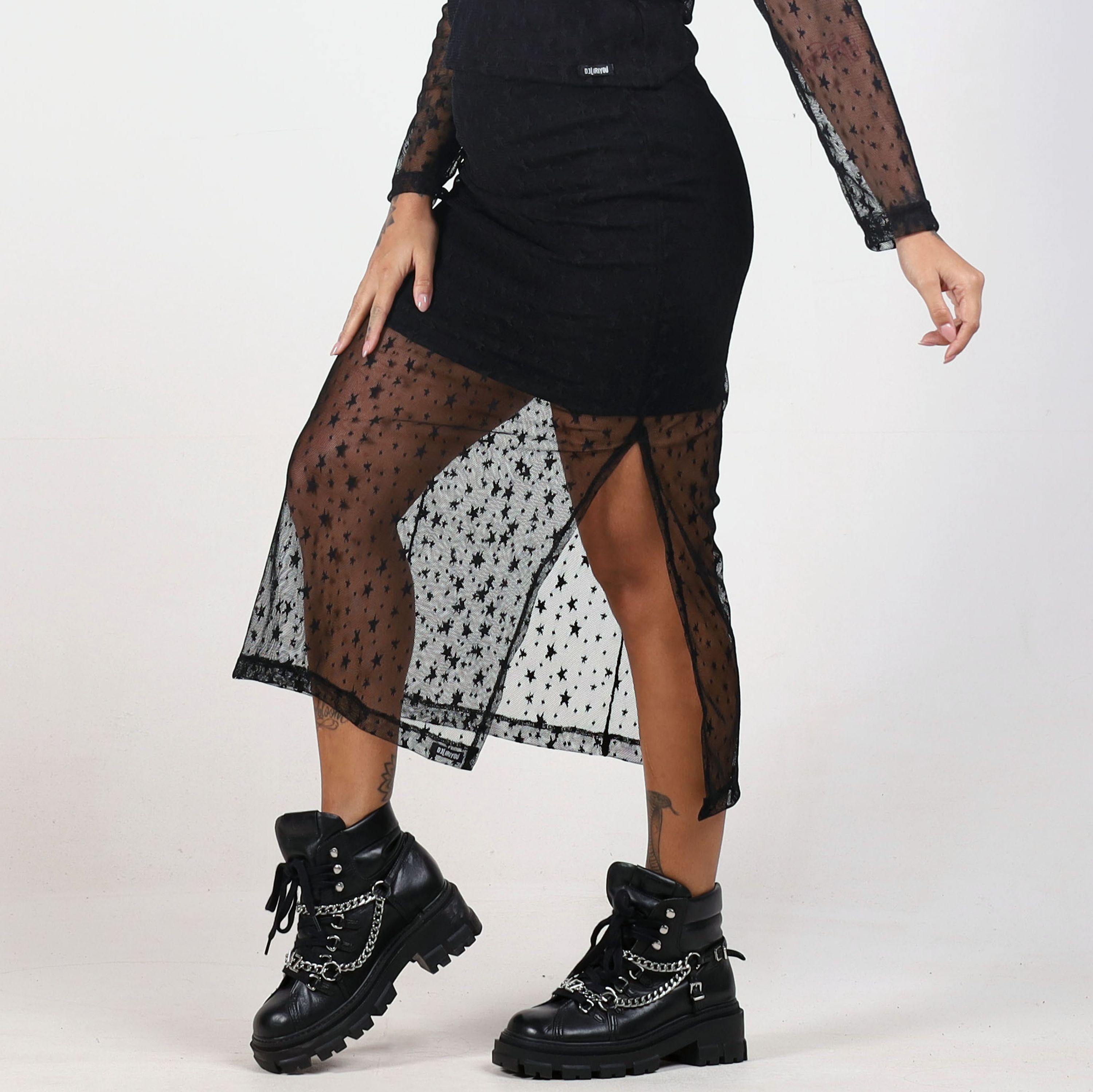 Saia Midi Fenda Babado Visco Black